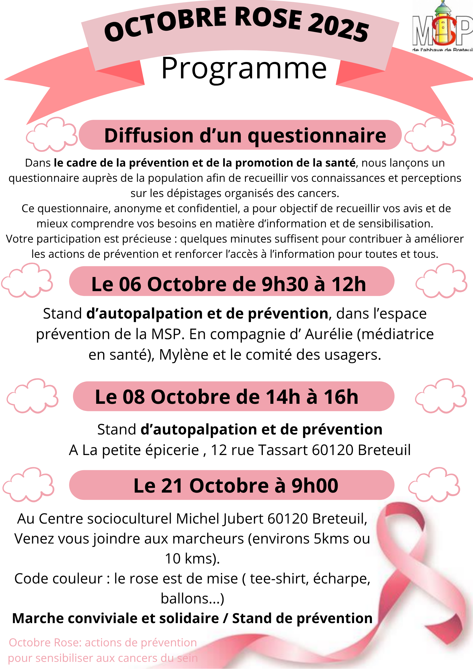 Tout au long du mois d’octobre, la MSP de Breteuil se mobilise pour la lutte contre le cancer du sein à travers plusieurs actions de prévention, d’information et de sensibilisation.